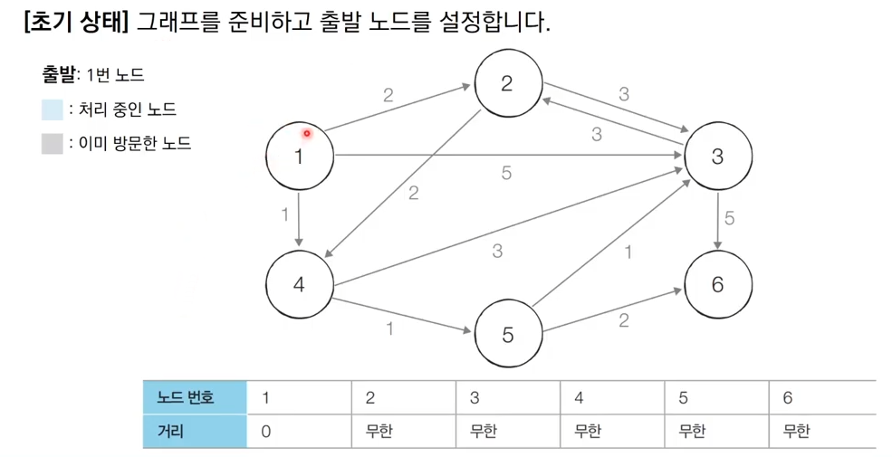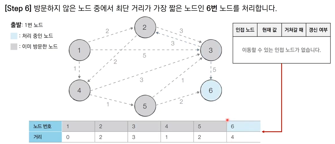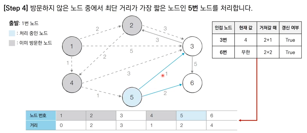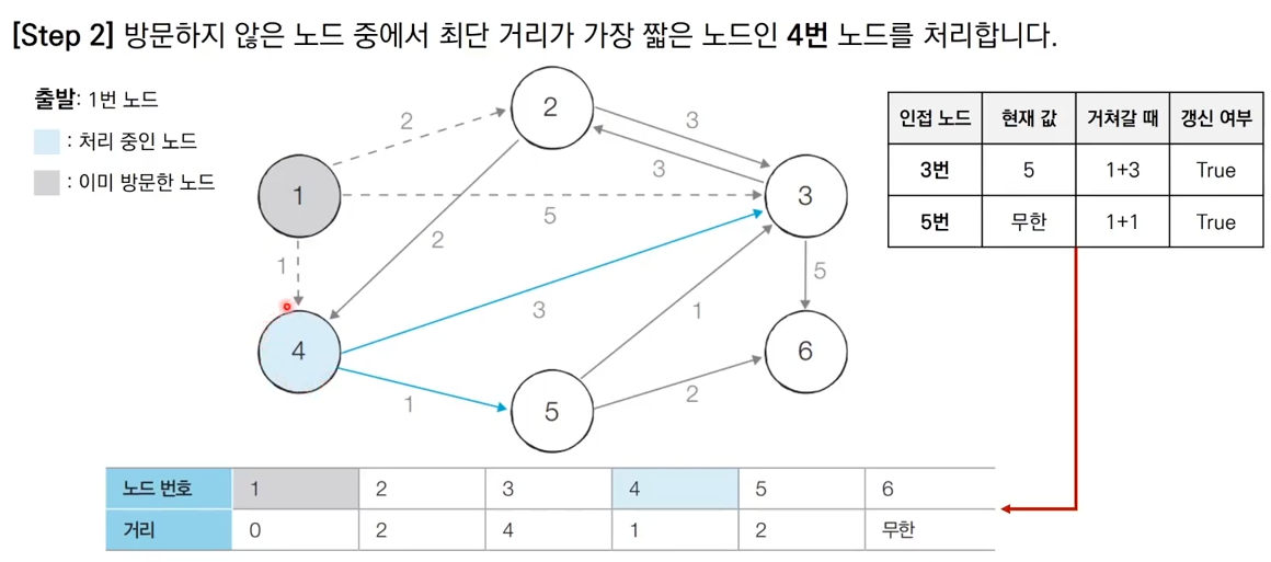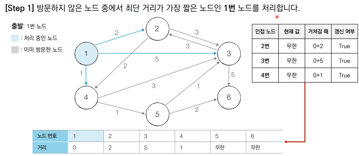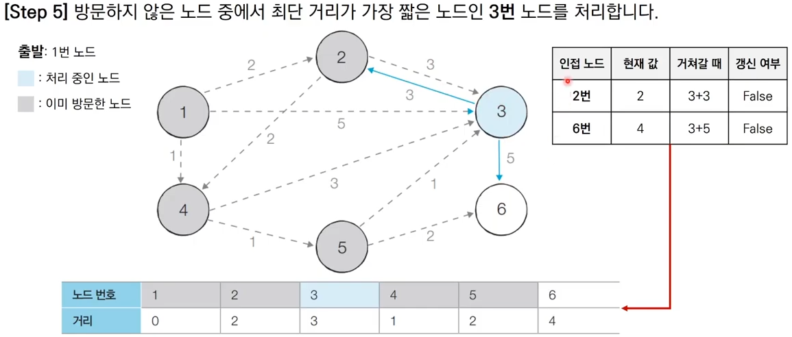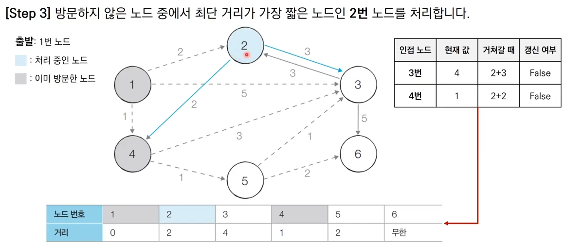 - 방문하지 않은 노드 중에서 최단 거리가 가장 짧은 노드를 선택한다.