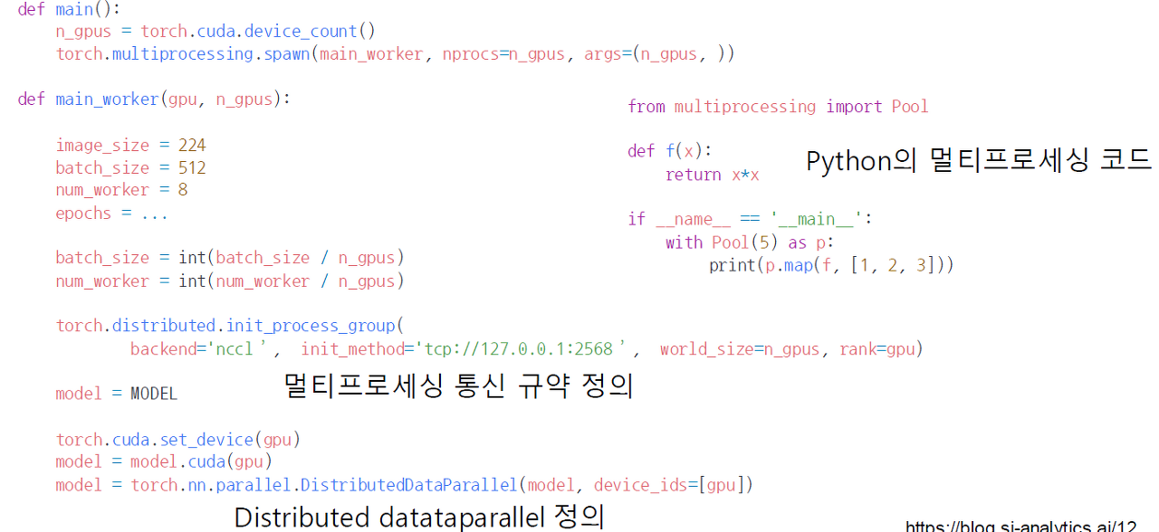 - DistributedDataParallel - 각 CPU마다 process 생성하여 개별 GPU에 할당