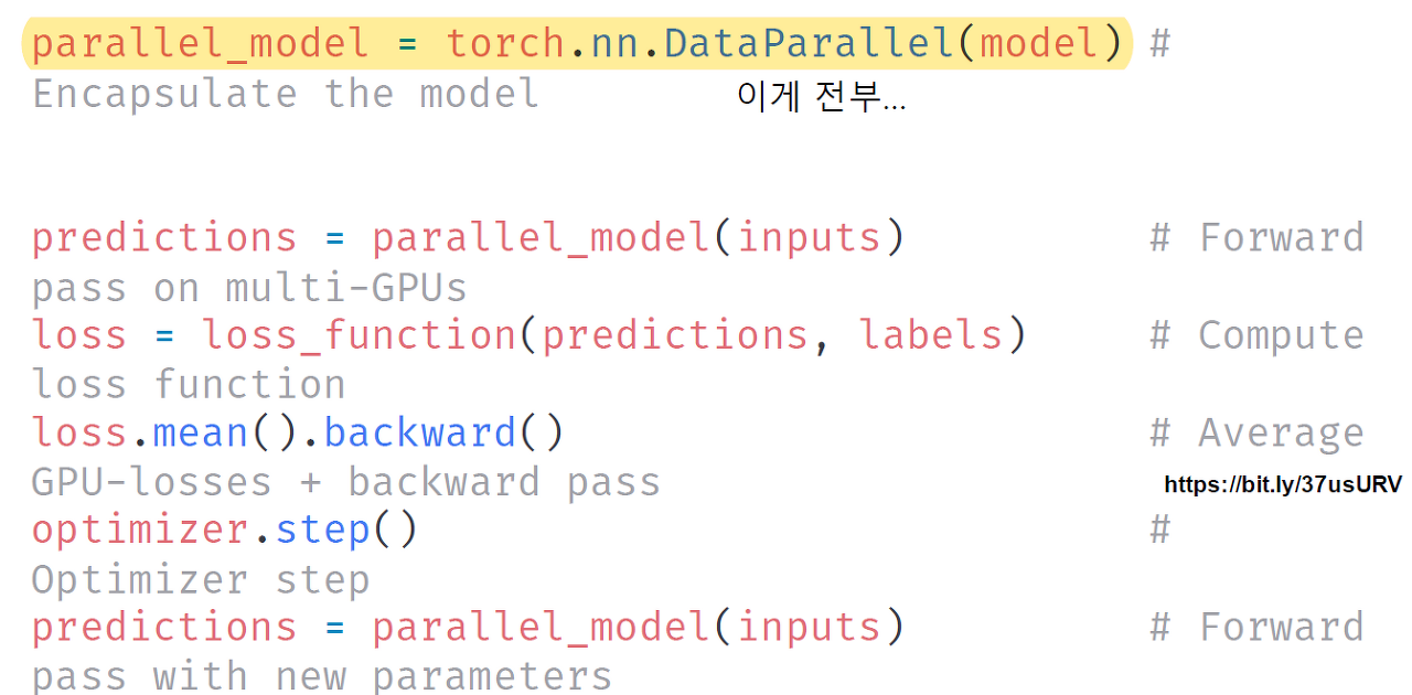 - 기본적으로 DataParallel로 하나 개별적으로 연산의 평균을 냄