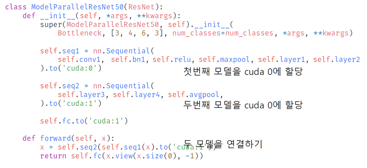 coda:0에서 처리한 것을 cuda:1으로 보내서 또 다른 처리를 하고, 마지막에 fc layer를 cude:1에서 처리한 것을 볼 수 있다. 단, 이렇게만 구현하면 병렬화가 제대로 안되어 병렬현상이 발생하므로, 앞에서와 같은 파이프라인 구축이 필요하다.