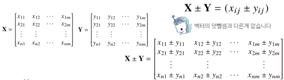 - 행렬끼리 같은 모양을 가지면 덧셈, 뺄셈을 계산할 수 있다
