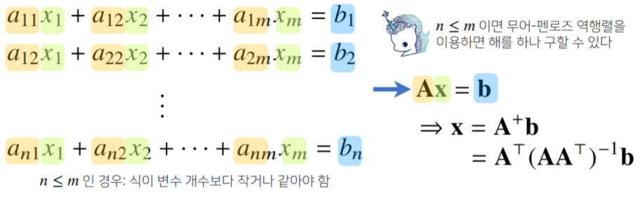 - 식이 변수 개수보다 작거나 같은 경우 (식의 개수 $\leq$ 변수의 개수), 무어-펜로즈 역행렬을 이용해 해를 하나 구할 수 있다