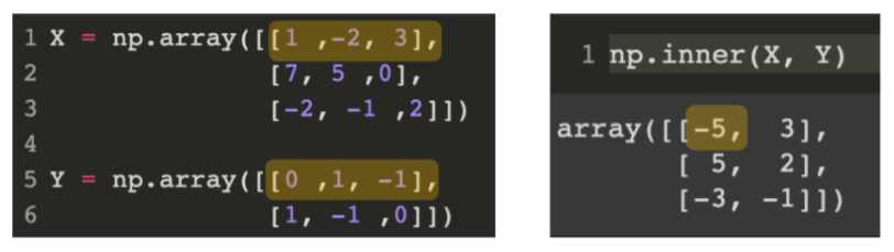np.inner는 i번째 행벡터와 j번째 행벡터 사이의 내적을 성분으로 가지는 행렬 계산- 수학에서 말하는 내적과 다르므로 주의