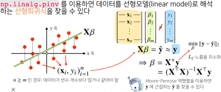 np.linalg.pinv를 이용하면 데이터를 선행모델(linear model)로 해석하는 선형회귀식을 찾을 수 있다- (변수 개수 $\leq$ 식의 개수) 인 경우, $X\beta$는 $y$를 만족하는 $X$를 찾는 것은 불가능하다