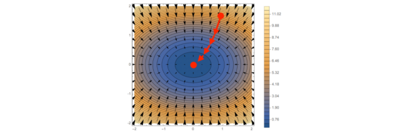 $- \nabla f$는 $\nabla (-f)$와 같고, 이는 각 점에서 가장 빨리 감소하게 되는 방향과 같다