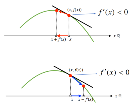 미분값이 음수일 때 미분값을 더하면 증가, 빼면 감소